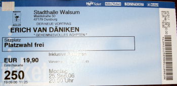 | Die Vorträge gingen jeweils 90 Minuten und es hat 2003 15 Euro und 2006 19,90 Euro Eintritt gekostet. Weitere Vorträge von Erich von Däniken findet man auf seiner Homepage Und hier noch die Seite von einem großen Däniken-Fan, von Tatjana. |