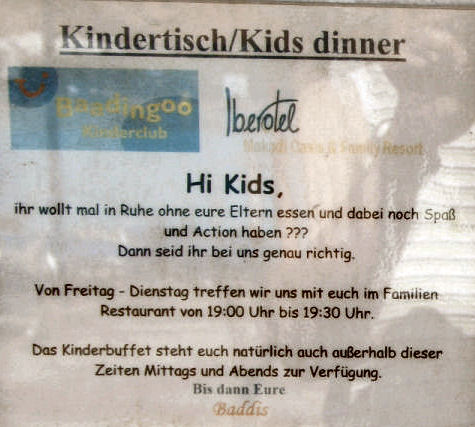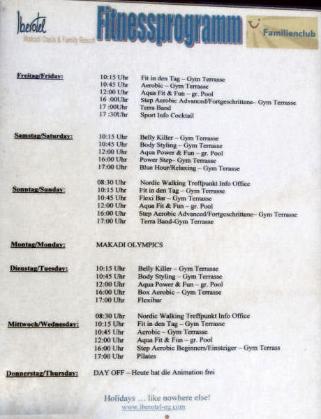 ![]() AnimationEin Thema, wo wir eigentlich nicht viel zu sagen können, da wir die zahlreichen Animationsangebote eigentlich nie wahrnehmen. Dieses Mal haben wir uns lediglich eine Show angeschaut, wo das ganze Animationsteam ein Krimi-Theaterstück aufgeführt hat. Das war ganz nett gemacht und einige von denen hatten tatsächlich schauspielerische Qualitäten.Die Animateure sind allesamt TUI-"Baddies" und waren durchweg freundlich und engagiert. Die Angebote hängen täglich an der Poolbar aus. Da gibt es Wassergymnastik am Pool, Boccia am Strand, Volleyball, Bingo und Box-Aerobic, diverse Shows und vieles mehr. Beim Frühstück gibt es übrigens täglich ein Infoblatt, wo neben den aktuellen Weltnachrichten (in Kurzform) auch das Animationsprogramm des Tages draufsteht. Hier ein paar Beispiele von Aushängen an der Poolbar: Fitnessprogramm Kreativprogramm Kindertisch |