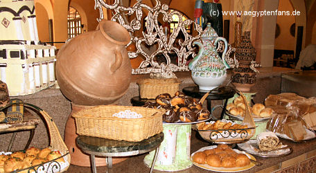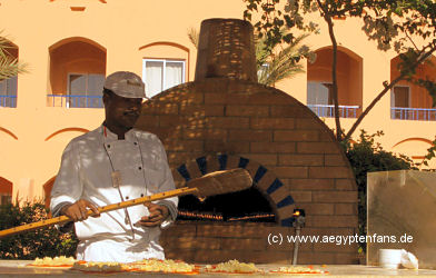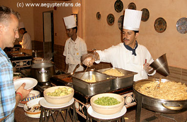 ![]() Essen: Mittag- und AbendessenWas in 2005 neu ist, aber ganz klasse, ist die Frau mit dem großen steinernen Backofen draußen vor dem Restaurant. Sie backt dort frisches Fladenbrot, das man sich während der Essenszeiten dort wegnehmen kann. Köstlich! Dazu gibt es im Speisesaal natürlich das passende Tahina (Sesamsoße). Wir waren begeistert.Auch sonst merkt man, dass man immer wieder versucht sich was neues für die Gaste einfallen zu lassen. Es gibt Themenabende, wo es Essen aus anderen Ländern (indisch, italienisch, griechisch, etc.) gibt. Und einmal die Woche gibt es einen Galaabend, wo alles schön geschmückt wird und wo im Kerzenschein gegessen wird. Am beliebtesten ist allerdings die Nudelstation. Dort stellt man sich sein Nudelgericht selber zusammen. Man sagt dem Koch, was man alles haben möchte (Tomatensoße, Tomatensoße mit Gehacktem, Knoblauchöl, Zwiebeln, Käse, Pilze, Auberginen, Paprika, etc.), der schmeißt das alles in eine Pfanne und noch einen Schlag Nudeln dazu. Lecker! Alles aufzuzählen, was es zum Mittag- und Abendessen gibt würde hier den Rahmen sprengen. Grob zusammengefasst kann man sagen, dass es täglich eine große Salat-Theke gibt, sowohl mit Salaten, die man sich selber zusammenstellen kann (also z.B. Tomaten, Gurken, Endiviensalat ohne Soßen), als auch mit fertig angerichteten Salaten (z.B. Linsen-, Kartoffel-, Tomaten-Salat). In zahlreichen Warmhaltebehältern gibt es unterschiedlichste Speisen: Kartoffeln, Reis, Pommes Frites, Gerichte aus Hühnchen, Rindfleisch, Lamm und Pute, diverse Fischgerichte und natürlich auch Gemüse. Zum Nachtisch kann man sich entweder frisches Obst, Obstsalat, Melonen oder Joghurt nehmen oder man wagt sich an die vielen, sehr süssen Sachen heran: Kuchen, Götterspeise, Sahnetörtchen und "Omm Ali" (ägyptische Milch-Brei-Spezialität). Wer nicht auf die süssen Sachen steht kann aber auch den Magen mit Käse schließen. Hierzu gibt es natürlich eine entsprechende Hartkäse-Ecke. Achja, fast vergessen: Zu den Mahlzeiten git es auch immer zwei verschiedene Tagessuppen. |