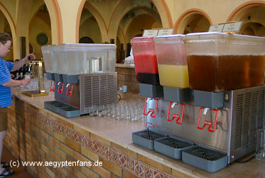 ![]() GetränkeIm Restaurant holt man sich seine Getränke selber. Hier gibt es Zapfanlagen für Säfte, Bier, Cola, Mirinda, 7up und Wein. Kaffee und Tee nimmt man sich auch selber. Außer beim Spätaufsteher-Frühstück, da kommt ein Kellner rum und schüttet ein. Das Spätaufsteherfrühstück ist eh sehr spärlich. Es wird in einem abgetrennten Bereich des Restaurants angeboten, da nur wenige Leute spät frühstücken.Eine Minibar auf dem Zimmer gibt es nicht. Es liegen jedoch pro Person eine gefüllte Wasserflasche im Kühlschrank. Sind die Flaschen leer, kann man sich jederzeit an der Bar oder an der Poolbar eine neue Flasche holen. An der Poolbar gibts natürlich (genauso wie an der Bar im Hauptgebäude) auch die unterschiedlichsten Getränke. Es gibt eine Zapfanlage mit Wasser, Karkade (ägyptischer Hibiskustee) und Ananas-Saft. Neben diversen antialkoholischen Köstlichkeiten (die Cola war 2005 an der Poolbar ziemlich schlapp) servieren die Kellner dort alles was man so zusammenmixen oder pur trinken kann. Die alkoholischen Getränke sind allerdings einheimische Marken. Der Ouzo z.B. sieht zwar aus, wie der teure, aber die Ettiketten sind nur gut nachgeahmt. Jemand der bestimmte Marken bevorzugt wird sich vermutlich nicht sehr darüber freuen, aber die Cocktails sind für den Nicht-Kenner sehr lecker und bunt gemischt. Bier kann man sich sogar an einer neuen "Löwenbräu"-Zapfanlage selber zapfen. Draußen an Poolbar und am Strand gibt es Getränke übrigens aus Plastikbechern. Verständlich, denn oft fällt mal was runter und da viele (besonders die Kinder) barfuß herumlaufen, gibts bei Plastikbechern keine Scherben in den Füßen. |