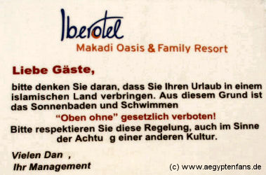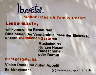 ![]() Sinnvolle HinweiseEs ist kaum zu glauben, aber wir haben in der Anlage tatsächlich niemanden oben ohne rumlaufen oder rumliegen gesehen. Es gab lediglich welche, die sich mit hinten geöffnetem Bikini zum Sonnen auf den Bauch gelegt haben. Aber da war ja auch nichts zu sehen. Ob allein schon ein solches Schild etwas bewirken kann? Sind viele Touristen, die oben ohne baden einfach nur falsch informiert?Das Publikum im Hotel hat sich sowieso außergewöhnlich gut benommen. Es gab weder sich besaufende, noch rumpöbelnde oder sonstwie auffällige Touristen. Sogar an die Kleiderordnung für das Restaurant, die auf riesigen Tafeln vor den Eingängen angebracht war hielten sich 95 % der Urlauber. ![]() Die ganzen Schilder gab es übrigens in deutsch, englisch und russisch. Genauso vielfältig wie die Gäste. Sogar ägyptische Familien machen hier Urlaub. |