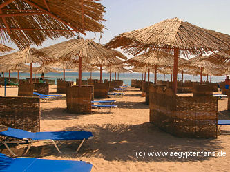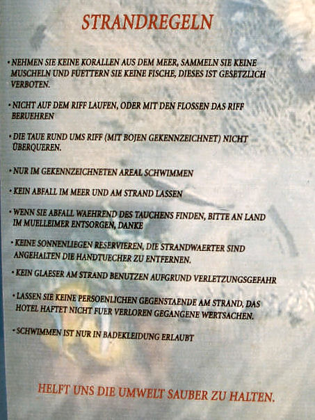 ![]() StrandZum Strand muß man erst mal ein bißchen laufen. Ist man im hinteren Bereich des Makadi Oasis (also im Bereich des Hinterausgangs) einquartiert, dann ist der Weg gar nicht so weit. Etwa 250 Meter. Wir hatten z.B. Zimmer Nr. 2344, das auch da hinten liegt. Der Weg zum Strand ist ein mit Bastmatten überdachter Gang, der ein wenig Schatten spendet. Am Strand angekommen findet man erst mal hunderte nebeneinander aufgestellte Liegen mit Sonnenschirmen und Windschutz. Zu jedem Schirm gehören zwei Liegen und in dem Windschutz ist man auch ein wenig vor den übrigen Gästen "geschützt" Man hat sozusagen seinen kleinen eigenen Bereich.An den Schirmen ist auch ein kleines rundes Holztischchen angebracht, auf das man seine Getränke stellen kann. Des weiteren hängt dort auch ein kleines rotes Fähnchen. Ist dieses "gehisst", bedeutet das, dass man von den Animateuren nicht animiert werden will. Das klappt ganz gut, aber vor den zahlreichen Anbietern von Schnorchelausflügen schützt die Fahne nicht. Aber so schlimm sind die auch nicht. Einen Platz haben wir immer bekommen und Liegenreservierer haben wir auch keine gesehen. Allerdings kann das auch daran liegen, dass wir nicht in der Ferienzeit da waren. In den Ferien soll das Hotel immer vollkommen ausgebucht sein. Vermutlich ist dann auch am Strand einiges mehr los. Am Strand gibt es übrigens schönen weichen Sand. Geht man allerdings ins Wasser rein, liegen dort spitze, mittelgroße Steinchen rum. Nix für zarte Fußsohlen. Badeschuhe sind daher zu empfehlen. Ein Hausriff gibt´s auch. Dazu schwimmt man ein kleines Stück raus (höchstens 50 Meter) bis zu einer Sandbank. Dahinter liegen mehrere kleine Riffe, die von Jahr zu Jahr jedoch leider immer mehr durch rücksichtslose Touristen geschädigt wurden. Es ist nur eine Frage der Zeit, bis es hier gar nichts mehr zu sehen gibt, weil alles tot ist. Dieses Jahr (2005) sahen die Riffe schon nicht mehr gesund aus. Strandregeln vom Makadi Oasis |