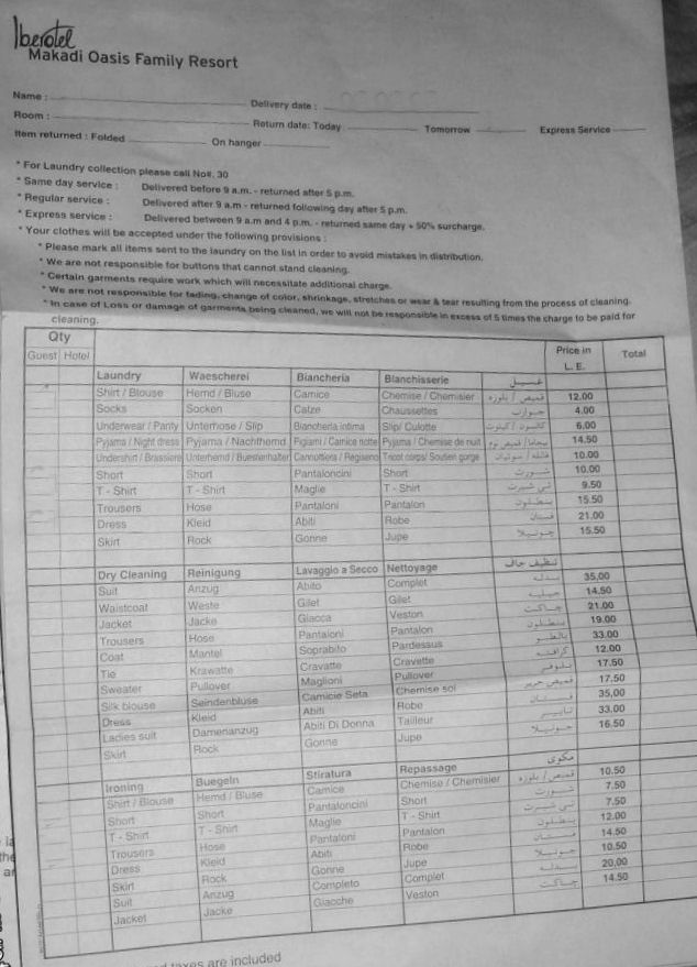![]() ZimmerDie Zimmer die wir bisher gesehen haben waren eigentlich größtenteils gleich. Einziger Unterschied: Doppel- oder Einzel-Betten. Jedes Zimmer ist im orientalischen Stil eingerichtet. Es gibt einen Kühlschank, einen Fernseher, eine abgetrennte Ecke mit einem Steinbett, wo mitreisende Kinder übernachten können. Ein kleiner Balkon mit einem Tisch und zwei Stühlen, ein großer, geräumiger Schrank und ein Badezimmer mit einer großen Duschecke. Dort macht das Duschen richtig Spaß. Eine große geflieste Ecke, wo man locker auch mal zu mehreren duschen kann.![]() Im Fernsehen laufen einige deutsche Sender: ARD, ZDF, Pro 7, Sat 1, RTL, RTL II, VOX, Deutsche Welle (ohne Gewähr, die Angaben sind mal wieder aus dem Gedächtnis). Saubergemacht wird täglich und es gibt sogar einen Wäscheservice. Hierfür hängt im Kleiderschrank ein Wäschebeutel in den man seine schmutzigen Klamotten rein legt. Dabei liegt ein Zettel, den man ausfüllen muss. Anzugeben sind die Anzahl der unterscheidlichen Kleidungsstücke und ob bügeln oder nicht bügeln. Zusätzlich lag sowohl 2004 als auch 2005 ein Zettel mit einem "Spezialangebot" dabei. "1 voller Wäschesack nur 12 Euro". Das haben wir dieses Jahr gemacht und am nächsten Tag war unsere Wäsche frisch gewaschen und gebügelt zurück. Wir haben uns natürlich überlegt, wie die dafür sorgen, dass in der riesigen Wäscherei auch alle Kleidungsstücke wieder zurück ins richtige Zimmer kommen. Die Frage konnten wir uns schließlich selber beantworten. Unsere Zimmernummer fand sich auf unseren Kleidungsstücken wieder. Teilweise auf den Waschzetteln, auf zwei weißen T-Shirts allerdings innen am Saum und auf einer Jeans am Innenfutter. Das findet bestimmt nicht jeder toll, wenn mit Stoffmalstift in die Kamotten geschrieben wird, daher sei hier darauf hingewiesen. Wir sind gespannt, was passiert, sollten wir nächstes Jahr die gleichen Kleidungsstücke zum waschen geben. Landen die dann im Zimmer 2344? ---> hier gibts den Wäschezettel mit Preisen. |