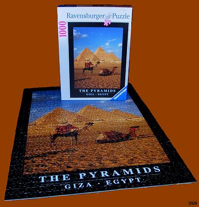 1000 Teile Puzzle "The Pyramids - Giza - Egypt"500 x 700 mmEin schönes Ravensburger Puzzle mit Pyramiden und Dromedaren. Wie man sieht, ist es schon fertig und wartet nur darauf irgendwo aufgehängt zu werden |