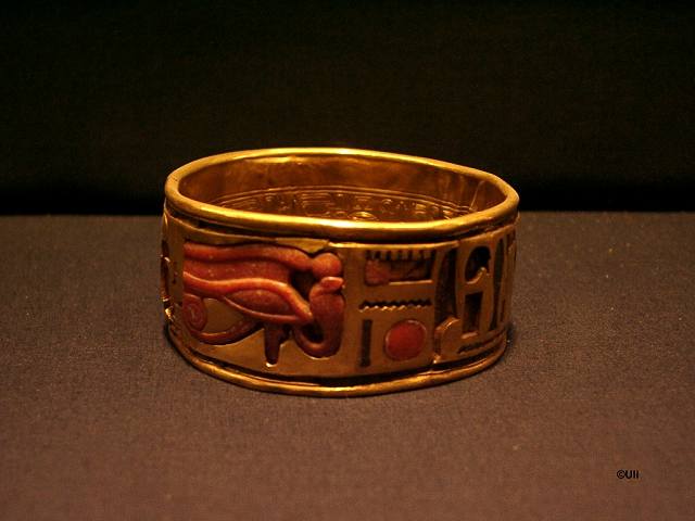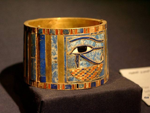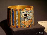 Der Grabschatz von Psusennes I umfasst unter anderem 26 Armreife. Dieser mit dem Udjat-Auge geschmückte Armreif ist einer von ihnen. Bild vergrößern
