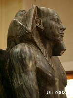 Diese Statue aus hartem Diorit stellt den Pharao Chephren mit dem Falkengott Horus im Nacken dar. Er wurde 1860 von Mariette in Gizeh in Chephrens Taltempel entdeckt. Bild vergrößern