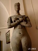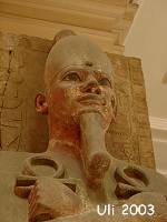Noch eine Statue Echnatons. Die Gelehrten sind sich nicht einig darüber, warum man Echnaton immer mit einem so unvorteilhaften Körperbau darstellte. Die einen glauben er habe aufgrund einer Krankheit tatsächlich so ausgesehen, andere glauben das hätte lediglich am Kunststil der damaligen Zeit gelegen und wieder andere erkennen gerade in dieser Statue eher seine Gattin Nofretete. Bild vergrößern