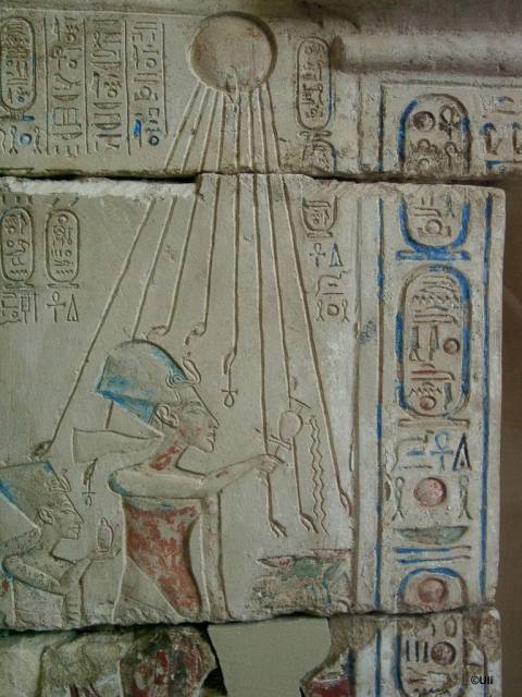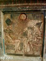 Dies ist ein Teil eines Hausaltars in Form eines Pylon. Die Reliefs zeigen Echnaton und seine Frau Nofretete bei der Anbetung des Gottes Aton. Bild vergrößern