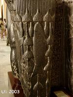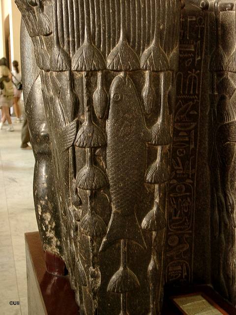 Dies ist der Teil einer Doppelstatue von Amenemhets III durch die er als Nilgott dargestellt wird. Daher sieht man hier auch Fische und Wasserpflanzen auf dem grauen Granit. Bild vergrößern