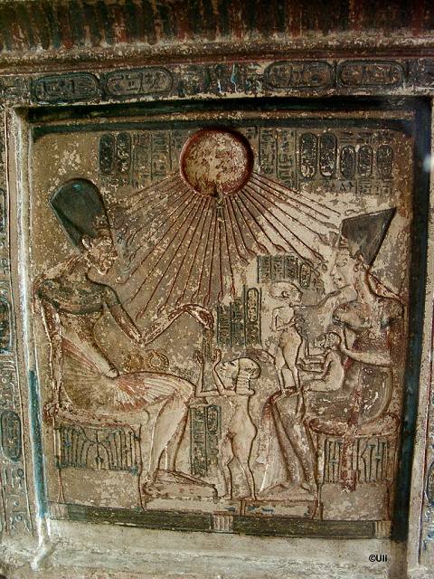 Diese Stele aus bemaltem Kalkstein wurde in Tell el-Amarna gefunden und zeigt den Pharao Echnaton und seine Familie. Bild vergrößern