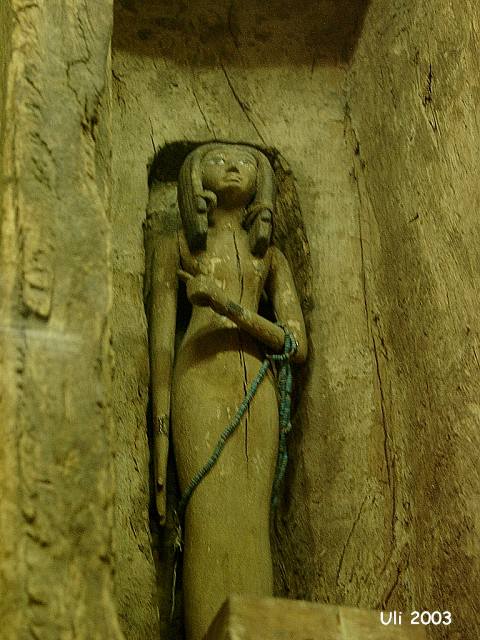 Die Dame auf dem Bild ist Ibentina. Sie ist die Gattin des Satnems in dessen Grab diese Statuette gefunden wurde. Über dem linken Arm trägt die Holzstatuette eine blaue Kette aus Fayance. Bild vergrößern