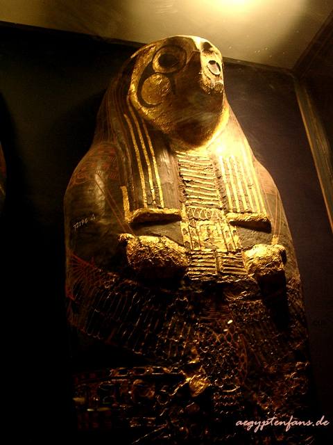 Der Falkenköpfige Innensarg von Scheschonk II aus bemalter Pappe mit dünnen Goldblechauflagen. Bild vergrößern