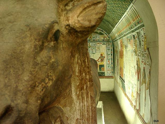 Im Hintergrund sieht man die in der Nähe des Hatschepsuttempels gefundene Hathor-Kapelle von Thutmosis III. Im Vordergrund steht die große Statue der Kuh-Göttin Hathor. Die beiden sind in ihrer Gänze recht schwierig zu fotografieren, da sie hinter Glas stehen und dieses ziemlich heftig spiegelt. Bild vergrößern