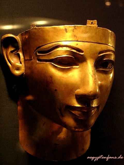 Die Totenmaske von Scheschonk II. Oben am Rand der Maske erkennt man noch die Halterungen mit denen die Maske an der Mumie befestigt wurde. Bild vergrößern