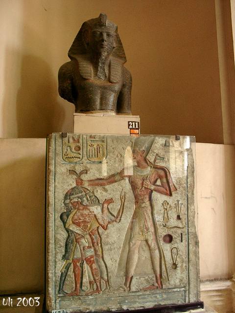 Oben steht eine Büste Merenptahs, dem Nachfolger Ramses II und darunter ein Kalksteinblock mit einem Relief, das Ramses II zeigt, wie er seine Feinde an den Haaren packt. Bild vergrößern