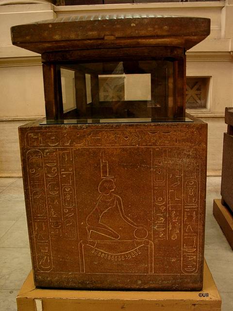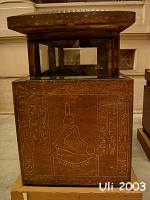Einer der Sarkophage der Pharaonin Hatschepsut. Hier sieht man die Göttin Isis, wie sie vor dem shen-Ring, dem Symbol für Schutz kniet. Für Hatschepsut wurden insgesamt drei Sarkophage gefertigt. Bild vergrößern