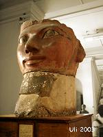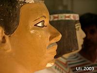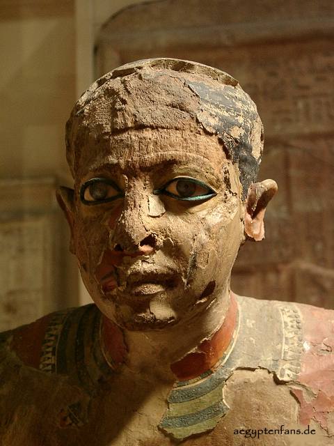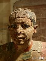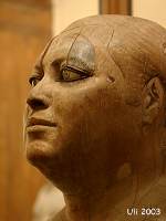 Die Statue des Vorlesepriesters Kaaper ist die älteste gefundene Holzstatue. Gefunden wurde sie in Sakkara in der Mastaba des Kaaper. Besonders eindrucksvoll sind die Augen, die unheimlich lebendig wirken. Bild vergrößern