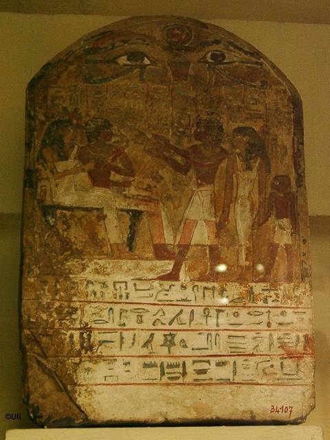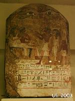 Auf der Stele des Nebamun überreicht ein Mann dem Verstorbenen eine Lotosblume, das Zeichen für die Wiedergeburt. Bild vergrößern