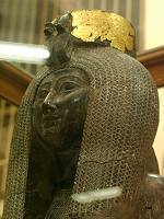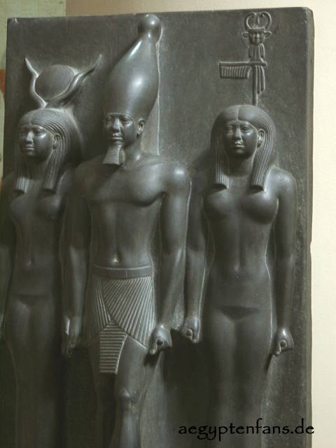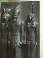 Die im Taltempel des Mykerinos gefundene Triade ist aus graugrünem Schiefer. In der Mitte der Pharao Mykerinos, der die kleinste der drei Pyramiden von Gizeh baute. Die Linke Figur stellt die Göttin Hathor dar und die rechte Figur stellt die Göttin des Gaues Diospolis Parva dar. Bild vergrößern