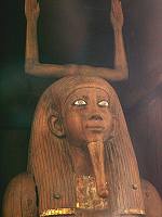 Die Holzstatue des Königs Hor. Sie sollte das Ka (die Lebenskraft) des Pharaos nach seinem Tod beherbergen. Über dem Kopf der Statue mit den gruseligen Augen befinden sich zwei ausgebreitete Arme, die Hieroglyphe für das Ka. Bild vergrößern