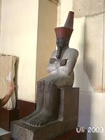 Diese Sitzstatue mit den Riesenfüßen stellt Mentuhotep II dar. Sie wurde im Totentempel Mentuhoteps in Deir-el-Bahari vom berühmten Archäologen Howard Carter entdeckt. Auf dem Kopf trägt Mentuhotep die rote Krone Unterägyptens. Bild vergrößern