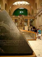 Ein Blick in die Halle des Ägyptischen Museums. Vorne links steht ein sogenanntes Pyramideon, die Spitze einer Pyramide. In diesem Fall handelt es sich um die Spitze der Pyramide des Amenemhets III (in Dashur) aus schwarzem Basalt. Bild vergrößern