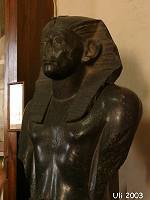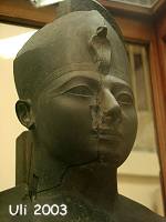 Schwarze Granitstatue des grimmig blickenden Königs Sesostris III. Gefunden wurde sie im Tempel des Mentuhotep in Deir-el-bahari. Bild vergrößern