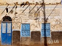 ![]() Auf der Insel Elephantine gibt es auch zwei nubische Dörfer. Der Besitzer dieses Hauses hat bereits eine Pilgerfahrt nach Mekka unternommen, was man an den Zeichnungen auf seiner Hauswand sehen kann. Bild vergrößern |