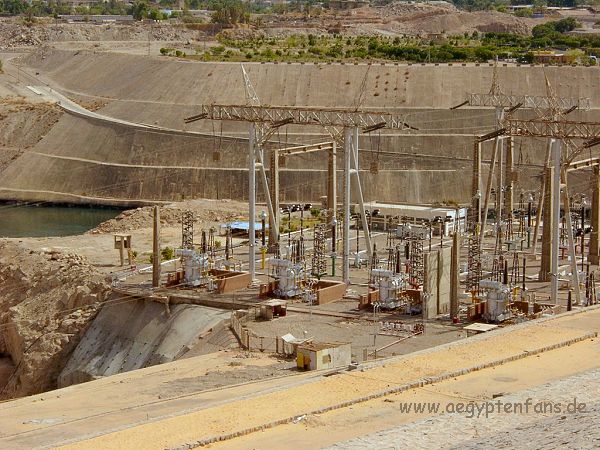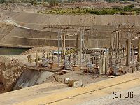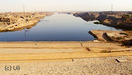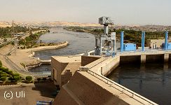 ![]() Blick vom Hochdamm auf den Nil. Der Damm ist 3,5 Kilometer lang und 114 Meter hoch. Der Bau kostete etwa zwei Milliarden Euro und beim Bau kamen etwa 450 Menschen ums Leben. |