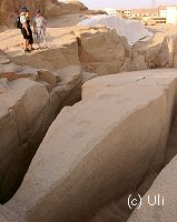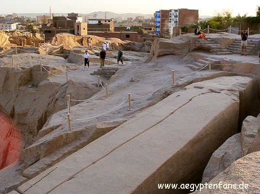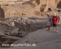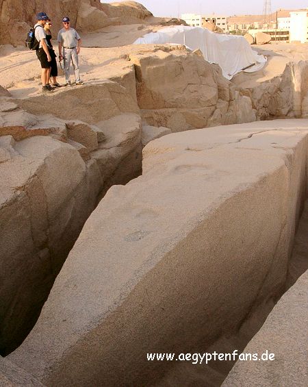 -------Ägypten-Wissen------ Der unvollendete ObeliskEr sollte der größte Obelisk werden, der je gefertigt wurde. Königin Hatschepsut gab ihn in Auftrag und hier im Steinbruch von Assuan sollte er an einem Stück aus dem Stein gehauen werden. Doch mitten in den Steinmetzarbeiten brach man ab. Es hatte sich ein Riss im Stein gebildet. Die bereits geleistete Arbeit war umsonst. |