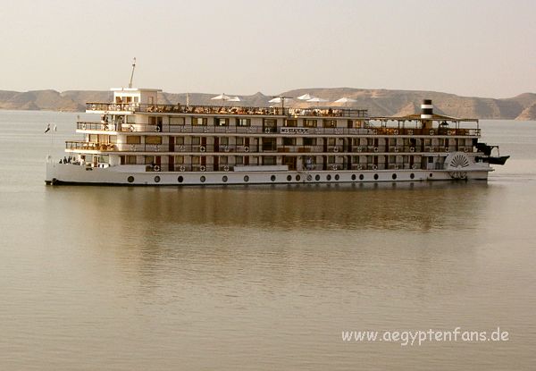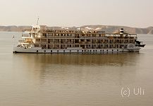 ![]() Im durch den Staudammbau entstandenen Nassersee versanken Dörfer der dort lebenden Nubier und zahlreiche Tempel. Einige Tempel wurden sogar komplett an höher gelegene Orte versetzt. Die Füllung des Stausees dauerte übrigens 12 Jahre. Auf dem Foto ist eines der wenigen Kreuzfahrtschiffe des Nassersees, die MS Eugenie. Bild vergrößern |