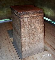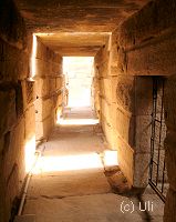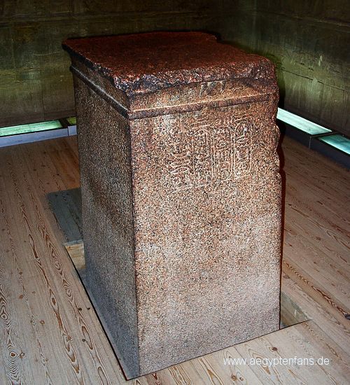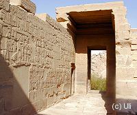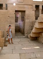 ![]() Im Innern des Tempels, im Allerheiligsten steht noch der Sockel aus Rosengranit für die heilige Barke und die Isisstatue. Bild vergrößern |
