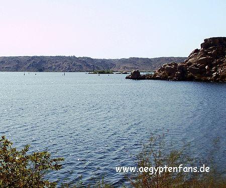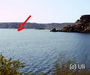 ![]() Vom heutigen Standort des Tempels aus kann man zur versunkenen Insel Philae blicken. Dort, wo der Rote Pfeil hin zeigt, stand früher der Tempel. Bild vergrößern |