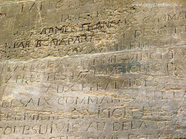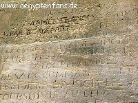 ![]() Napoleon nahm bei seinem Eroberungszug durch Ägypten auch viele Wissenschaftler mit, um altägyptische Bauwerke zu erforschen. Damit begann die moderne Ägyptologie. Die französische Inschrift in dieser Wand, die Napoleon einmeißeln ließ, soll an diesen Kriegszug erinnern. Bild vergrößern |