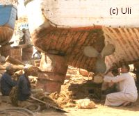 Die Abfahrt von der alten Schiffswerft war nicht uninteressant, denn dort bekam man mal nicht den üblichen Touristenanblick mit Händlern und Andenkenshops zu sehen, sondern olle Bagger, alte Schiffe, überall ein bißchen Schrott und einige Pause machende Arbeiter. Dem Kapitän unseres Bootes war es aber offensichtlich unangenehm, dass er uns über den hügeligen Sandweg, auf dem hier und da Schrott und verrostete Schiffsteile lagen, führen musste. Wir versichertem ihm natürlich, dass wir das eigentlich ganz ok fanden. Geglaubt hat er uns wahrscheinlich nicht. |