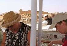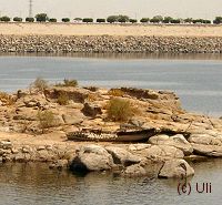 Neben dem Kalabscha-Plateau gab es noch ein kleines Inselchen mit einem Schiffswrack drauf. "Dort sind zwei riesige Krokodile gesichtet worden. 9 bis 12 Meter lang! Seeehr gefährlich!" erklärte uns Atef. Uns wurde schon ein bißchen mulmig, und man mochte sich gar nicht mehr nah ans Wasser stellen. Schließlich hätte jeden Moment ein riesiges grünes Reptil aus dem Nilschlamm hervorschnellen können. - Doch nichts geschah, alle blieben unversehrt. Das erhoffte Krokodilfoto blieb allerdings auch aus. |