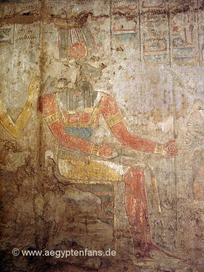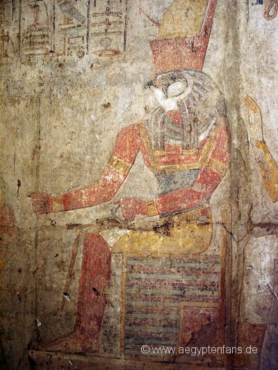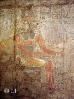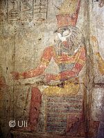 ![]() Der Opferraum hat eine sehr niedrige Decke und zwei vieleckige Säulen. Die bunten Malereien an den Wänden sind teilweise noch gut erhalten. Wie hier z.B. eine Zeichnung des Gottes Chnum. Bild vergrößern |