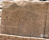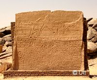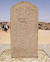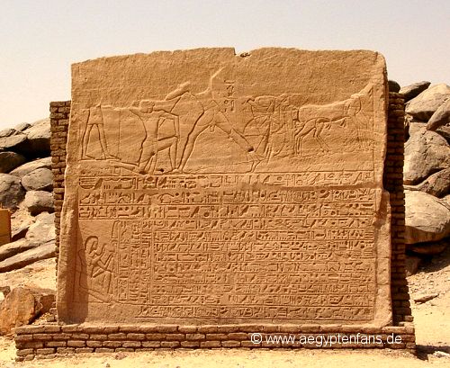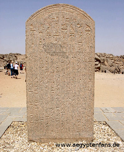 ![]() Draußen an der nördlichen Mauer des Tempels steht diese Stele von Pharao Psammetich II. Er regierte nur 6 Jahre und siegte in dieser Zeit über die Nubier, wovon auch die Stele berichtet. Bild vergrößern |