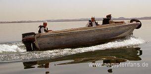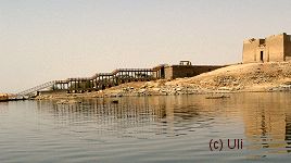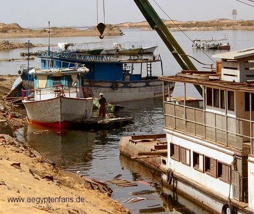 Ganz in der Nähe des Assuan-Staudammes liegt der Kalabsha-Tempel und das Felsheiligtum Beit El Wali. Auch hierhin gelangt man wieder mit einem Motorboot. Die eigentliche Anlegestelle, wo sonst die Motorboote mit den Touristen abfahren, konnte an dem Tag, wo wir da waren allerdings nicht genutzt werden. Deshalb wartete unser Motorboot an einer alten Schiffswerft auf uns. | ![]() Von der kleinen Schiffswerft fuhren wir ab |
