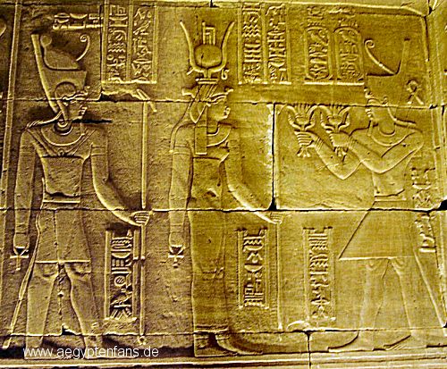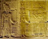 ![]() Der Kalabsha-Tempel ist dem nubischen Ortsgott Mandulis geweiht. Dieser wird auf Releifs oft von der Göttin Isis begleitet, die ebenfalls in Kalabsha verehrt wurde. Bild vergrößern |