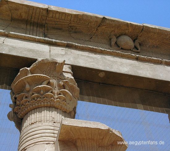 ![]() Die geflügelte Sonne und zwei Uräus-Schlangen über dem Eingangsportal. Bild vergrößern |