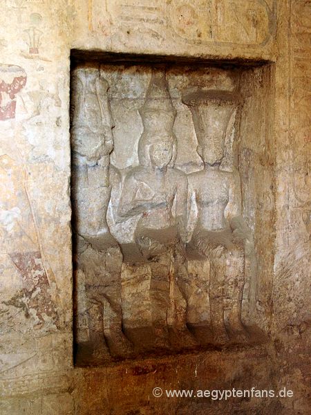 ![]() Diese Statuenniesche befindet sich im Opferraum des Beit El-Wali. In der Mitte steht der Pharao Ramses II. links ist der widderköpfige Gott Chnum dargestellt und rechts die Göttin Anuk. Bild vergrößern |
