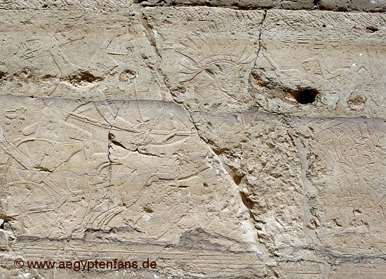 ![]() In der Vorhalle sieht man Reliefs mit Kriegsszenen, in denen Ramses II. im Streitwagen gegen Nubier, Syrer und Lybier kämpft. Bild vergrößern |