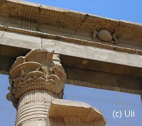 ![]() Der Kiosk von Kertassi stand früher am Eingang eines Steinbruchs und wurde der Göttin Hathor geweiht. Ihr Kopf ist auch oben auf den Säulen abgebildet. Bild vergrößern |