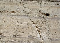 ![]() Dies ist die Westwand des offenen Hofes. Auf der linken Seite findet man ein Relief mit einer Reinigungsszene des Pharaos durch die Götter Horus und Thot. Rechts ist eine Inschrift etwa aus dem Jahre 248 von einem Militärverwalter. Er befiehlt Schweinezüchtern, dass sie ihre Tiere vom Tempel fernhalten sollen. Bild vergrößern |