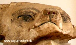 ![]() Außergewöhnlich sind die Anubis-Schakale aus Sandstein. Sie haben rote Augen und rote Nüstern. |