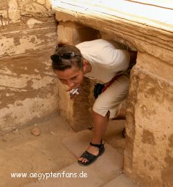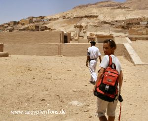 Gegenüber des Tempels war ein kleines Restaurant, dessen Besitzer bei unserer Ankunft meinte unbedingt auf unsere Fahrräder aufpassen zu müssen. Also haben wir unsere Fahrräder dort angekettet und als wir halb vertrocknet aus dem Tempel zurückkamen, haben wir natürlich auch dort einen Tee getrunken. Danach ging es mit den Rädern zurück Richtung Tickethäuschen und von dort links ab Richtung Ramesseum. Einen Zwischenstopp gab es am Merenptah-Tempel. Im Führer hatten wir von außergewöhnlichen Schakal-Köpfen mit gruseligen roten Nüstern gelesen. Für solche gruseligen Sachen sind wir natürlich immer zu haben. |