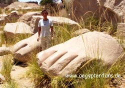 Überall liegen im Ramesseum riesige Teile von Statuen herum. Füsse, Hände, meterhohe Oberkörper und Köpfe. Das wurde natürlich alles fleißig fotografiert. Besonders Nico hatte die ganze Zeit den Finger auf dem Auslöser, da sie ja das erste Mal im Ramesseum war. | ![]() Füsse von Ramses II |