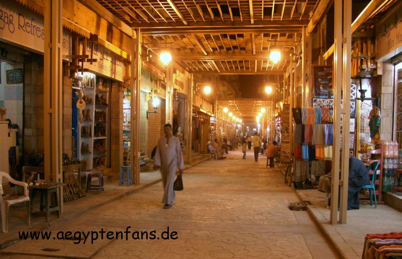 Nach einem hervorragenden Abendessen im El Gezira Garden setzten wir mit dem kleinen Motorboot des Hotels auf die andere Nilseite über. Es war Vollmond, der Luxortempel wurde wunderschön beleuchtet. Vorbei an den rufenden Kutschenfahrern spazierten wir zum Basar. Aufgrund von gewaltigen Umbaumaßnahmen in ganz Luxor war es auf dem Weg zum Basar ziemlich staubig, was Ulis Kontaktlinsen gar nicht gefiel. |