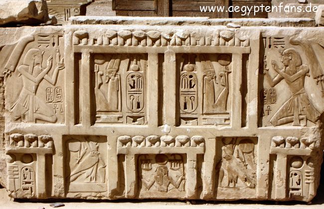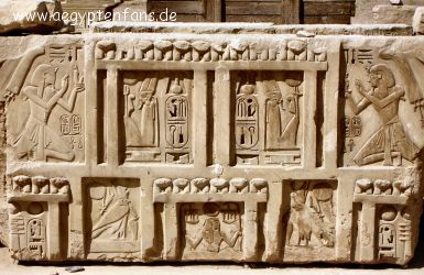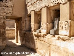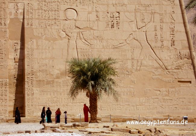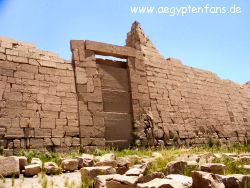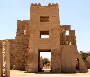 ![]() Das "Hohe Tor" ist 19 Meter Hoch und steht am Eingang des Tempelbezirks. In den Innenräumen hat Ramses III auch schon manche Nacht verbracht. Auf einigen Reliefs sieht man ihn mit seinen Haremsdamen. |